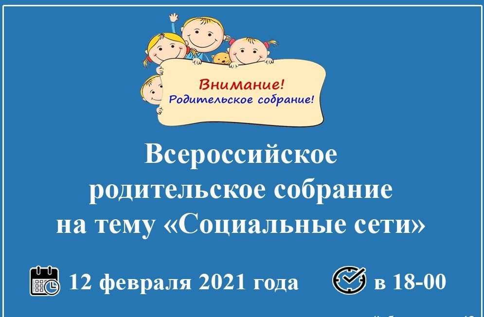 12.02.2021Минпросвещение России информирует о проведении 12 февраля 2021г. в 18:00 по московскому времени Всероссийского родительского собрания на тему "Социальные сети" в рамках которого родителей ознакомят с популярными среди детей социальными сетями, особенностями их интереса к ним.