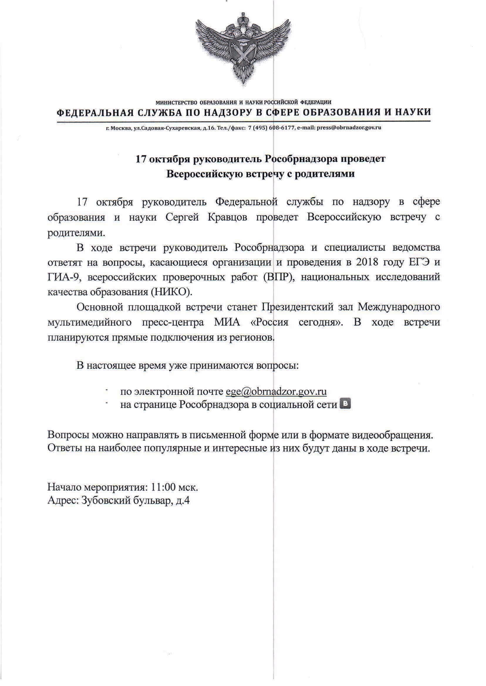 17 октября руководитель Федеральной службы по надзору в сфере образования и науки Сергей Кравцов проведет Всероссийскую встречу с родителями . Пошаговой сценарий смотрите в разделе "Информация дл