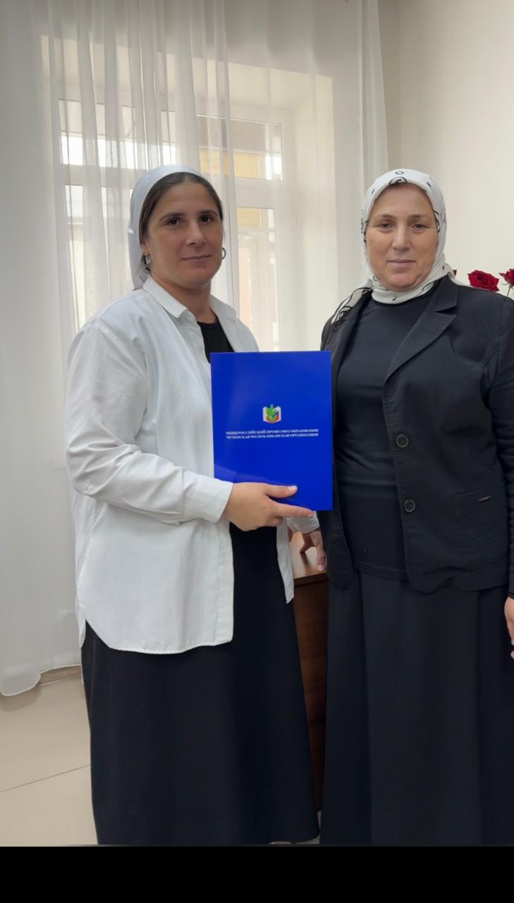 Дирктор школы Юнусова Разет Султановна, вручила благодарность от Общероссийского  Профсоюза Образования Чеченской Республиканской организации председателю  ППО Албастовой Мадине Руслановне.