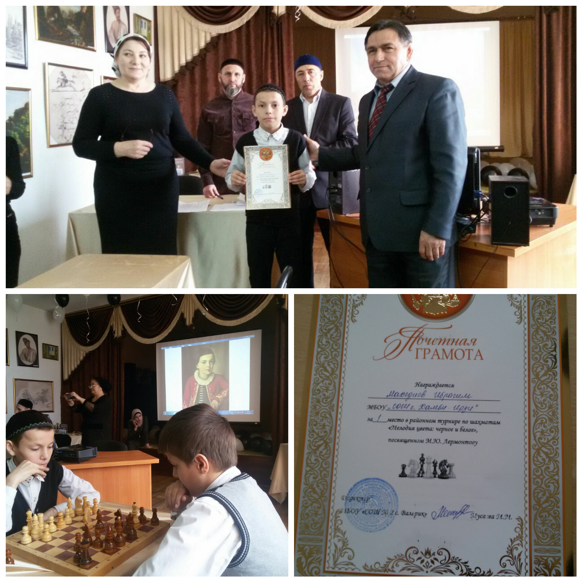Махедиев Ибрагим МБОУ "СОШ им.Р.Эльмурзаева с.Хамби-Ирзи" занял 1 место в районном турнире по шахматам "Мелодия цвета: черное и белое" посвященном М. Ю. Лермонтову