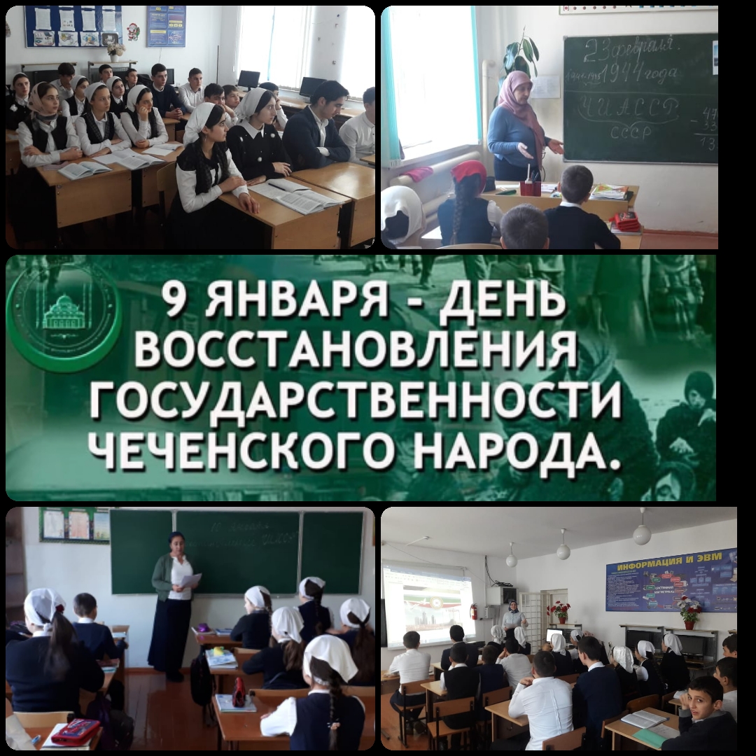 10.01.2019Согласно плану работы по ВР 9,10 января 2019 года в МБОУ «СОШ им.Р.Эльмурзаева с.Хамби-Ирзи» проведены следующие мероприятия приуроченные ко Дню восстановления государственности ЧИАССР: